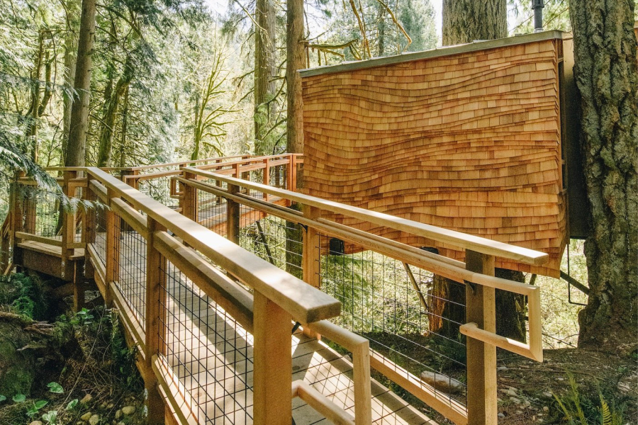 Ananda, completed in 2021, is the first-ever ADA-accessible commercial treehouse. Supported by two beautiful Douglas firs, Ananda features a floor-to-ceiling windows that overlook the Raging River. It’s luxuriously appointed with stunning fir floors and walls, a fully plumbed half bath, a king bed, and a gas fireplace. A mini-fridge allows guests of Ananda to stay tucked away for the entirety of the stay if desired. Ananda is perfectly situated along the edge of the property for maximum privacy.